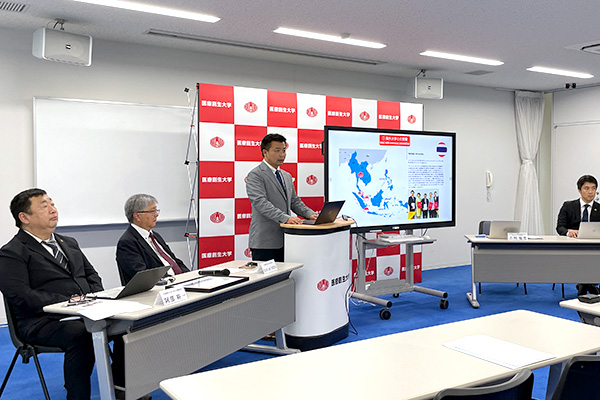 会見では、Goh Ah Cheng学長代行、健康医療科学部長の古川 勉寛 教授、学生・国際部長の阿部 裕一 教授、健康医療科学部 理学療法学科長の齋門 良紀 教授が出席し、今回の認証に至った経緯や、審査内容、教育内容、今後の展望などについて説明しました。