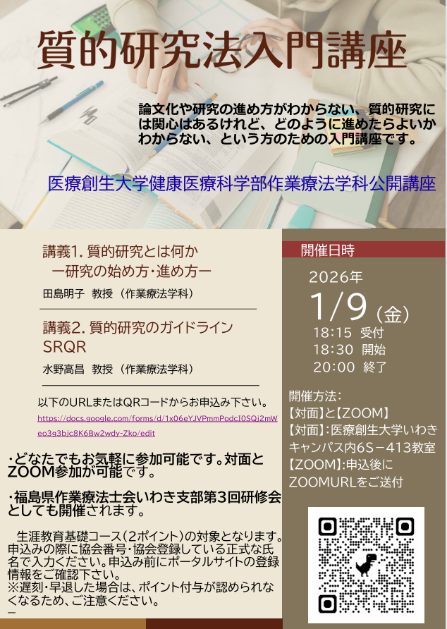 お知らせ2025/12/25【作業療法学科】「質的研究法入門講座」開催(2026年1月9日(金)18時30分~)