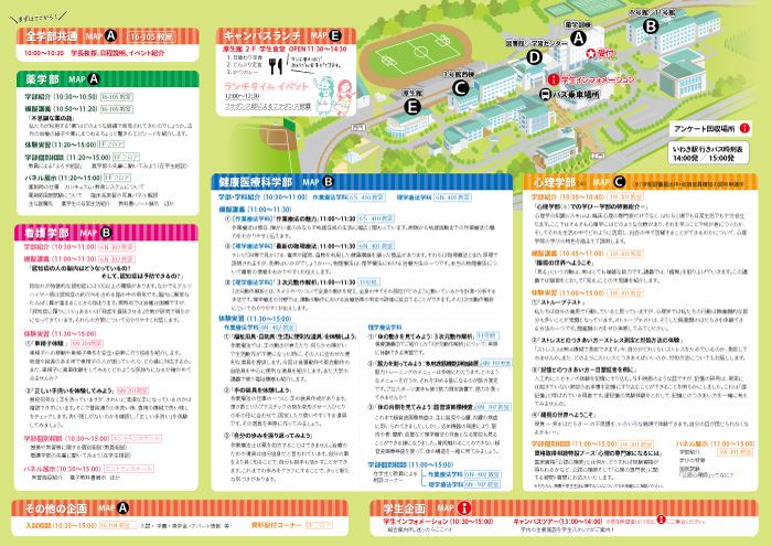 - 学生企画:薬学部生の日常生活、教科書・ノート展示、先輩に聞いてみよう!(在学生相談コーナー)