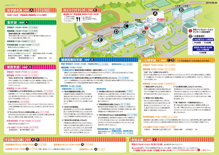 - パネル展示:カリキュラム・教育システムについて、臨床系実習の写真パネル解説、薬剤師の仕事、主な就職先、、国家試験について など
