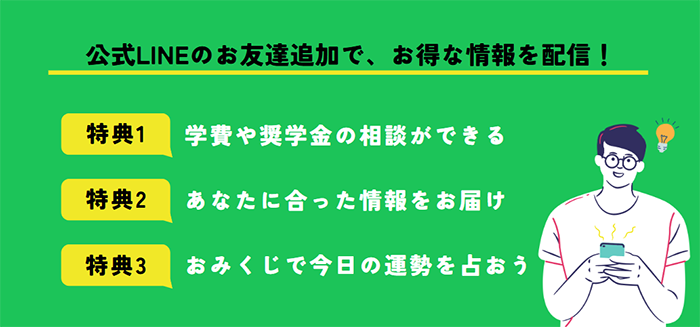 また、本学の公式LINEでは学費や奨学金の相談も受けています。 適性診断やおみくじなど楽しめるコンテンツも盛りだくさん。