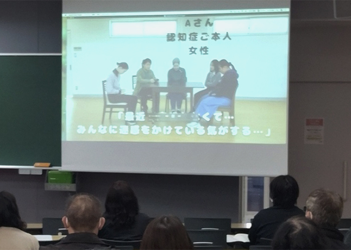 「認知症サポーター養成講座」では、学生が自ら企画・出演した“認知症の方への対応方法”をテーマにした寸劇を映像化し、講座内で上映しました。これにより、学生は講座運営の実際を体験的に学ぶことができます。