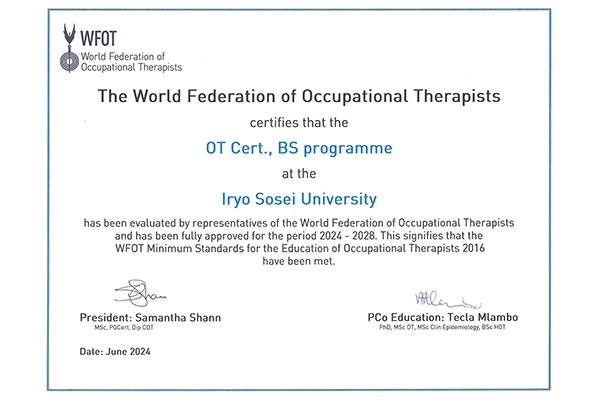 医療創生大学作業療法学科は、2024年6月に福島県ではじめて世界作業療法士連盟(WFOT)認定校となりました(認定期間:2024/1/1~2028/12/31)。※認定期間はWFOTにより4年間ごとに更新されます