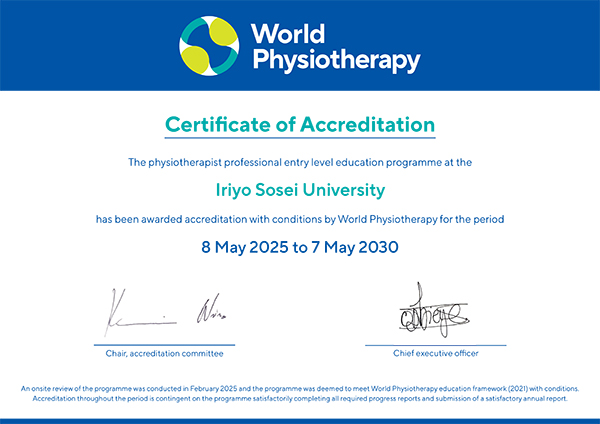医療創生大学 理学療法学科は、世界理学療法連盟から日本で初めて教育認証を取得しました(出典:大学プレスセンター「医療創生大学が世界理学療法連盟から国際基準の理学療法教育として日本で初めて認証」)。これは、本学の教育内容が世界基準を満たしていることの証明です。
