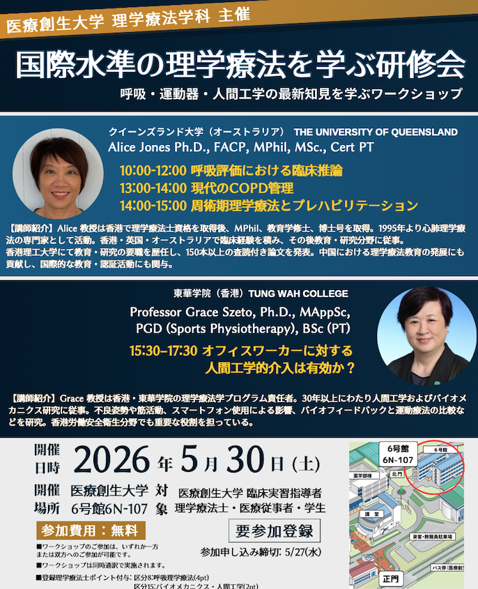 この度、地域の理学療法士の皆様への還元の一環として、呼吸・循環領域と運動器・人間工学領域の理学療法において国際的に活躍されている2名の理学療法士を講師としてお迎えし、最新の知見と実践に基づいた「国際水準の理学療法」を学ぶ機会を企画いたしました。