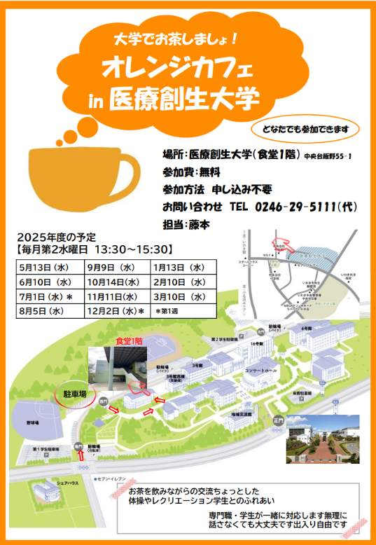 いわき市内には、すでに11か所の認知症カフェがありますが、この度、本学においても実施することになりました。いわき市の認知症カフェ事業「オレンジカフェ以和貴」となっていますので、以下のいわき市ホームページに掲載していただいています。
