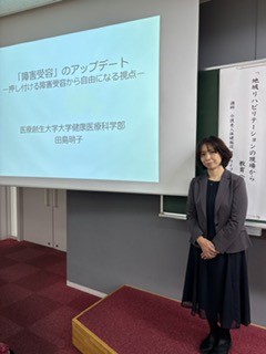 作業療法学科田島明子教授は、1日目には、「高齢期作業療法学のUp date―教育の質的転換と人権・共生の視点からー」というタイトルの講演を行いました。本講演では、人権・共生の観点から、スコットランドで進む人権ベースの認知症者への支援体制について紹介し、当事者参画とエンパワメントを重視する国際的潮流を日本の作業療法教育に接続する意義について、また作業的公正の概念に触れ、当事者の語り・ナラティブ教材活用の重要性やその方法論・効果についてお話されました。