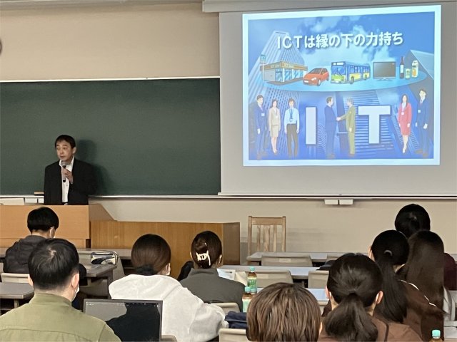 最後に学生からの質問に答える形で、東日本計算センターの田中様より「これからも、ネットワーク、データベース、ユーザインタフェースは無くならない技術(むしろもっと必要とされる技術)であり、特に心理学部で学ぶ領域は、人間とICTが接する部分(ユーザインタフェース)の設計に重要である」とのお話をいただきました。