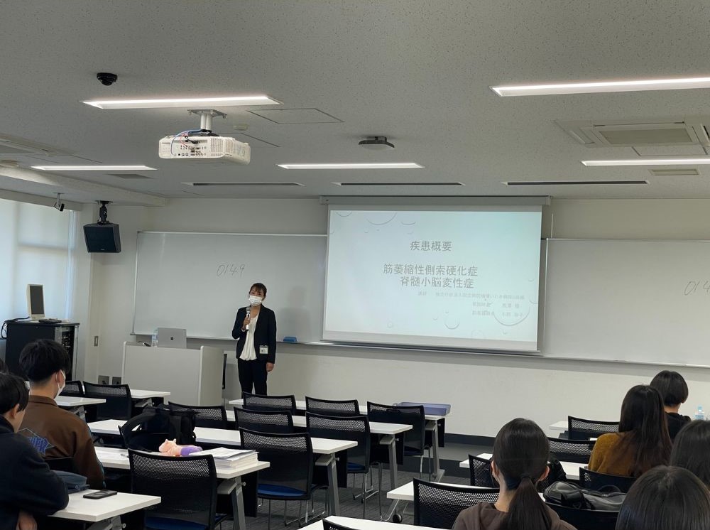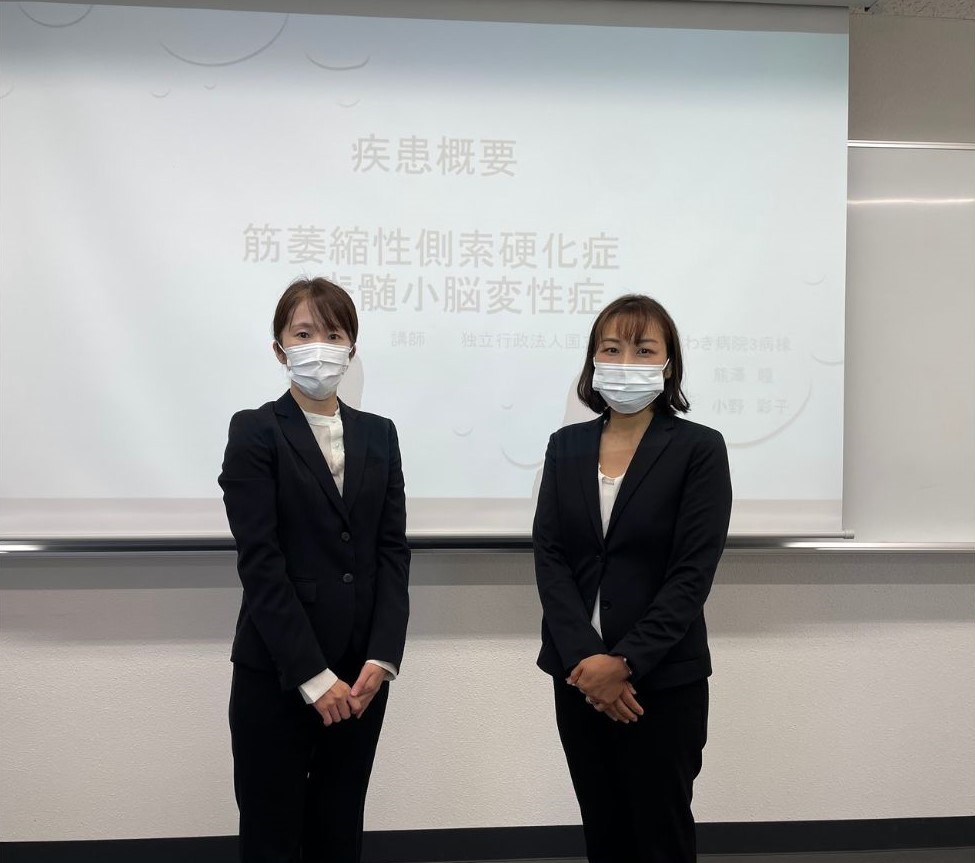 健康生活看護学(成人・慢性期)の授業において、独立行政法人国立病院機構 いわき病院で勤務されている看護師の熊澤様、小野様をお招きし、「神経難病患者の看護」についてご講義をいただきました。いわき病院は、主に神経難病を専門に治療や看護を行う医療機関です。