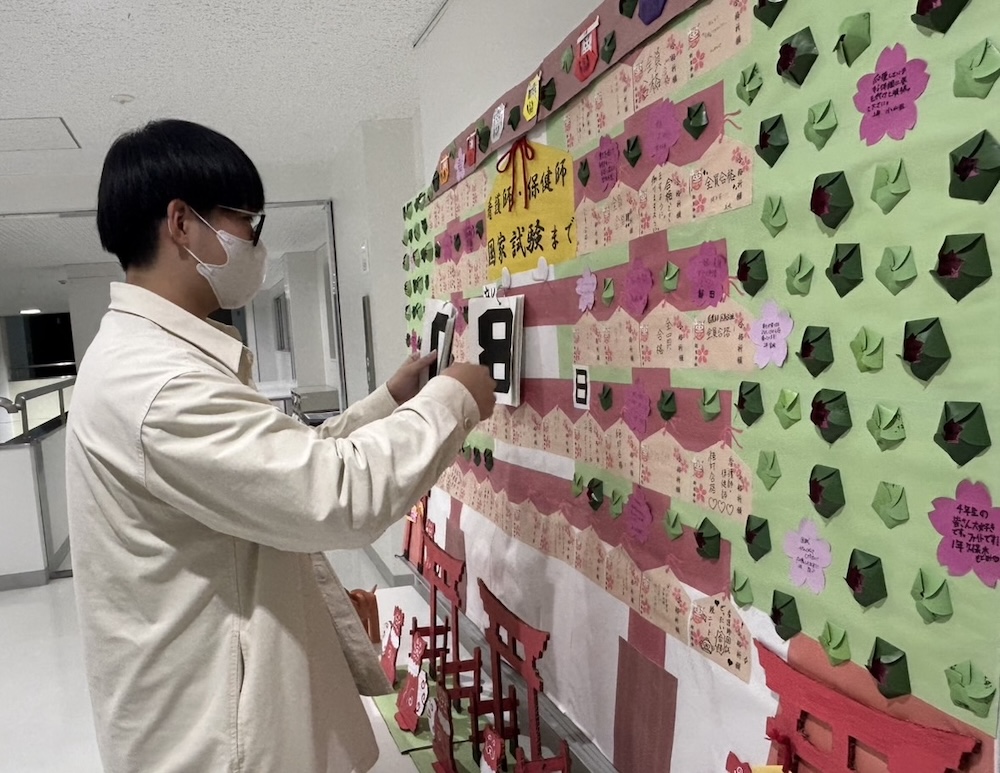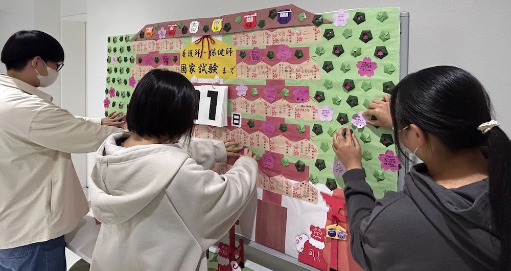 国家試験対策委員会として、4年生に向けた応援メッセージと国試までのカウントダウンカレンダーを作成しました。1、2、3年生だけでなく、先生方からもメッセージを頂き、看護学部全員で応援していますという思いや、桜が満開に咲きますようにと願いをこめて作成しました。在学生と先生方からのメッセージを読んで、温かい気持ちになっていただけたら嬉しいです。