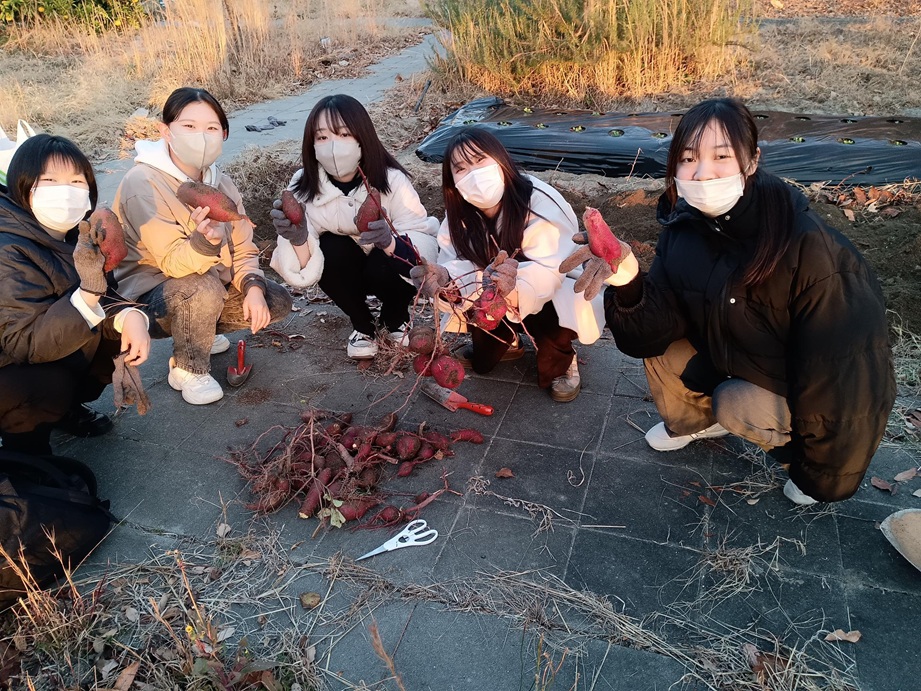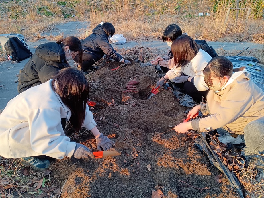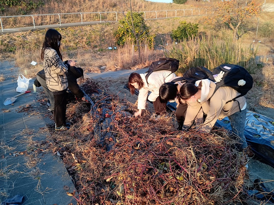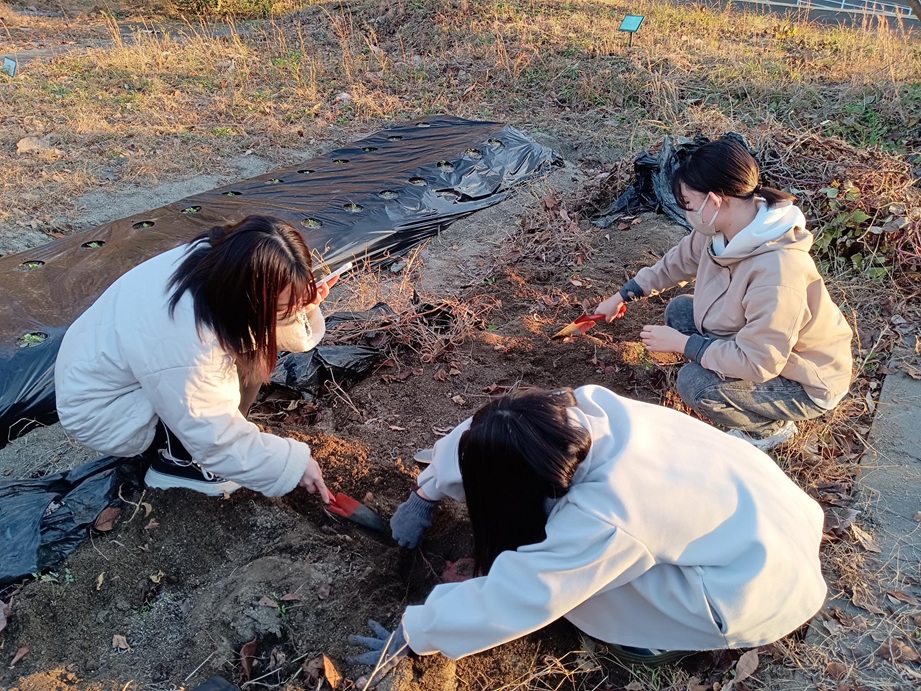 作業療法学科の学生が中心で活動しています園芸愛好会では、春から色々な野菜(ナス、キュウリ、ピーマン、ミニトマト、オグラなど)を栽培していました。実は、秋の楽しみとしてサツマイモも栽培していました。もう冬になってしまいましたけど。