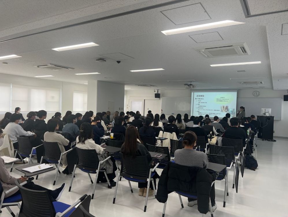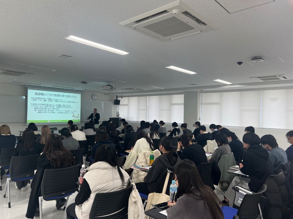 午前中は、主に3年生の在校生を対象に、国試・就職対策を目的としたシンポジウムを実施しました。シンポジストとして4名の卒業生にご登壇いただき、学生時代の経験や現在の臨床現場での実践、国家試験や就職活動に向けた心構えなど、貴重なお話を伺うことができました。また、野崎学科長からは、看護師という職業において避けて通れない夜勤を踏まえ、心身の健康を保つための「睡眠の重要性」について講演が行われました。