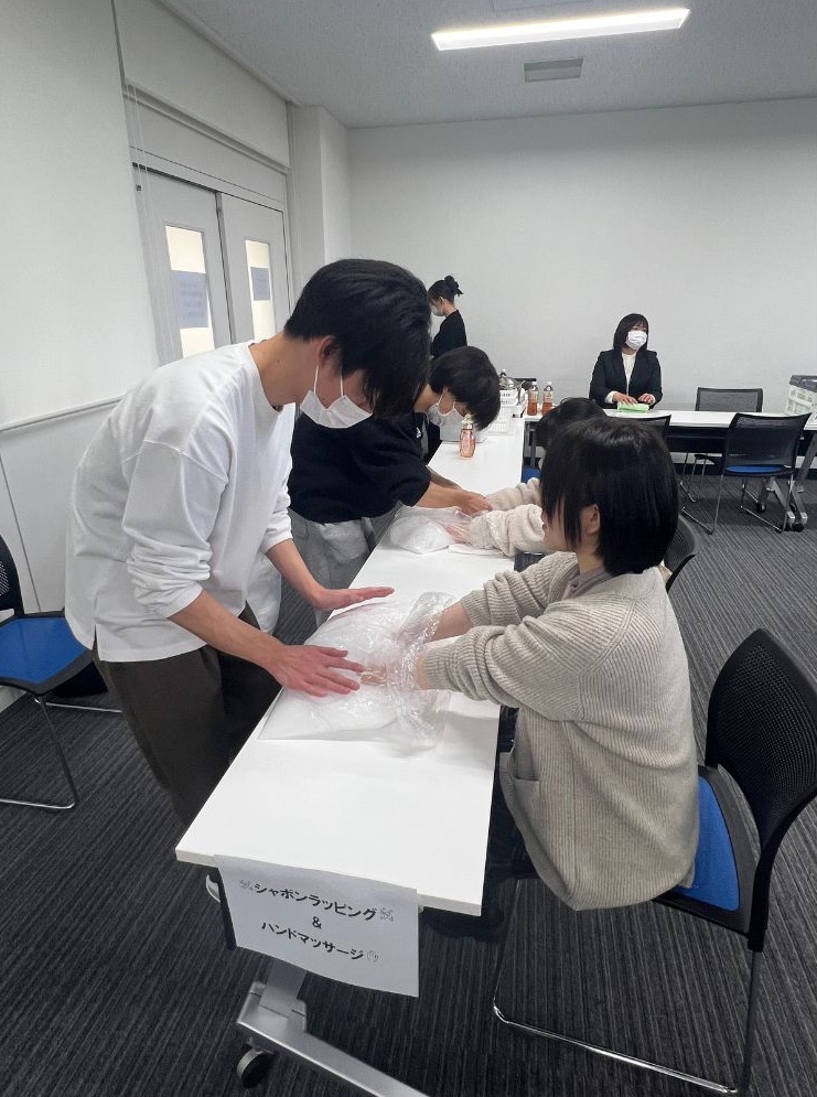 午後は親睦会として、ささやかな軽食を囲みながら、卒業生・教員・在校生有志による交流の時間を設けました。シャボンラッピングやハンドマッサージを通して和やかな雰囲気の中、卒業生が現場での経験を語る姿や、後輩との再会・交流を温かく見守る様子が随所に見られました。