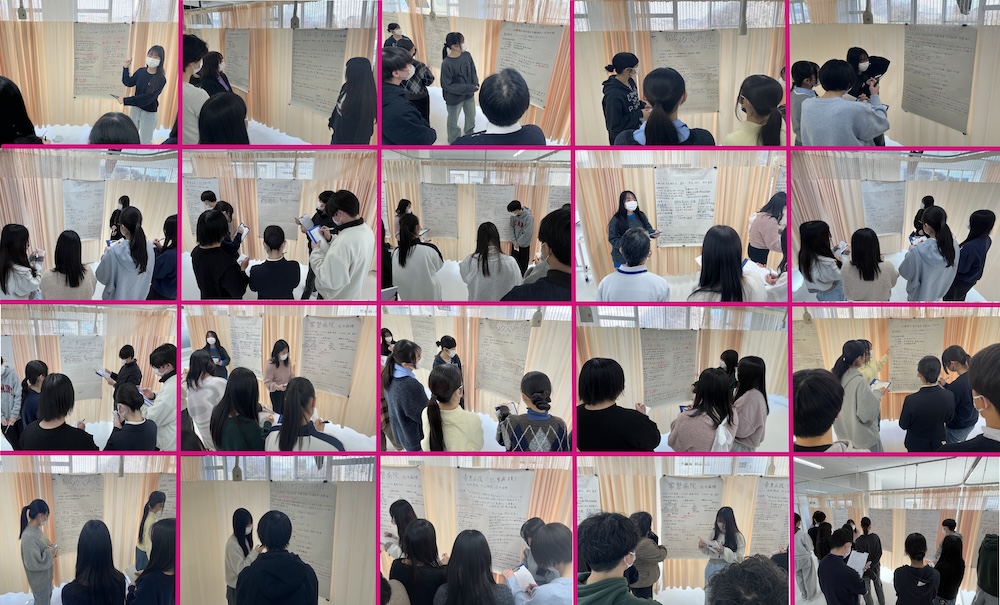当日は、実習グループごとに分かれ、実習を通して得た気づきや成長、今後の課題について話し合い、その内容を1枚のポスターにまとめました。学生たちは「ホーム」と「ゲスト」の役割を交代しながら、ポスターを用いて発表、質疑応答、意見交換を行い、他グループの学びにも積極的に触れる姿が見られました。