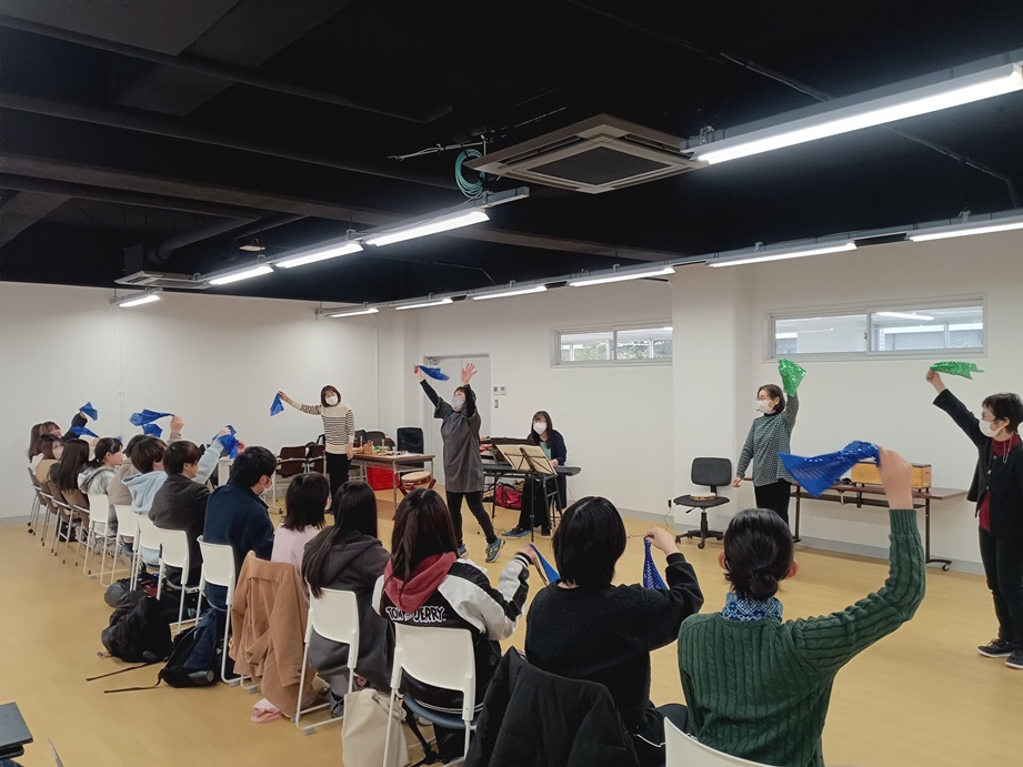 今回は、いわき音楽療法研究会ミュージックフォレストから4名の先生をお招きし、実際に体験しながら学びました。