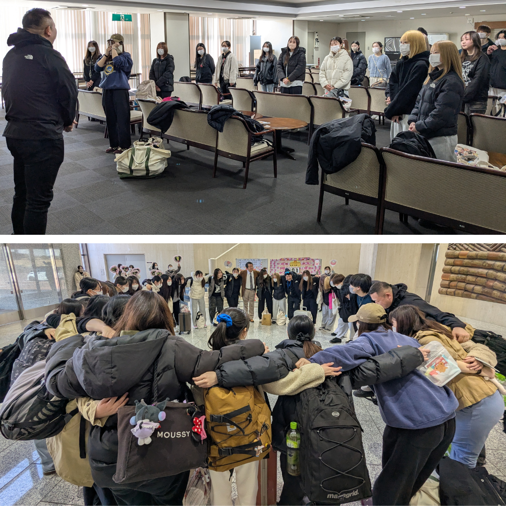 <野崎学科長からの応援メッセージの後は、円陣を組んで気合いを入れています>