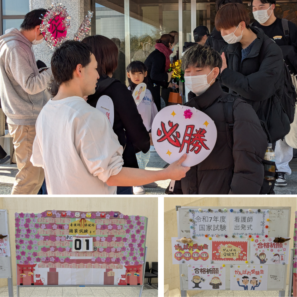 昨年は、国家試験に向かう先輩を応援する側だった4年生。あの日は力強くエールを送っていた学生たちも、いざ自分自身の試験を目前にすると、自然と表情が引き締まり、緊張した面持ちを見せていました。それでも後輩たちの温かな声援を受け、静かにうなずきながら会場へと向かう姿が印象的でした。