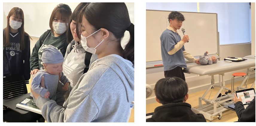 (リアルな赤ちゃん人形を用いた運動発達の講義)