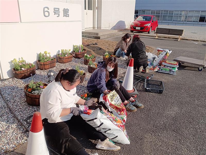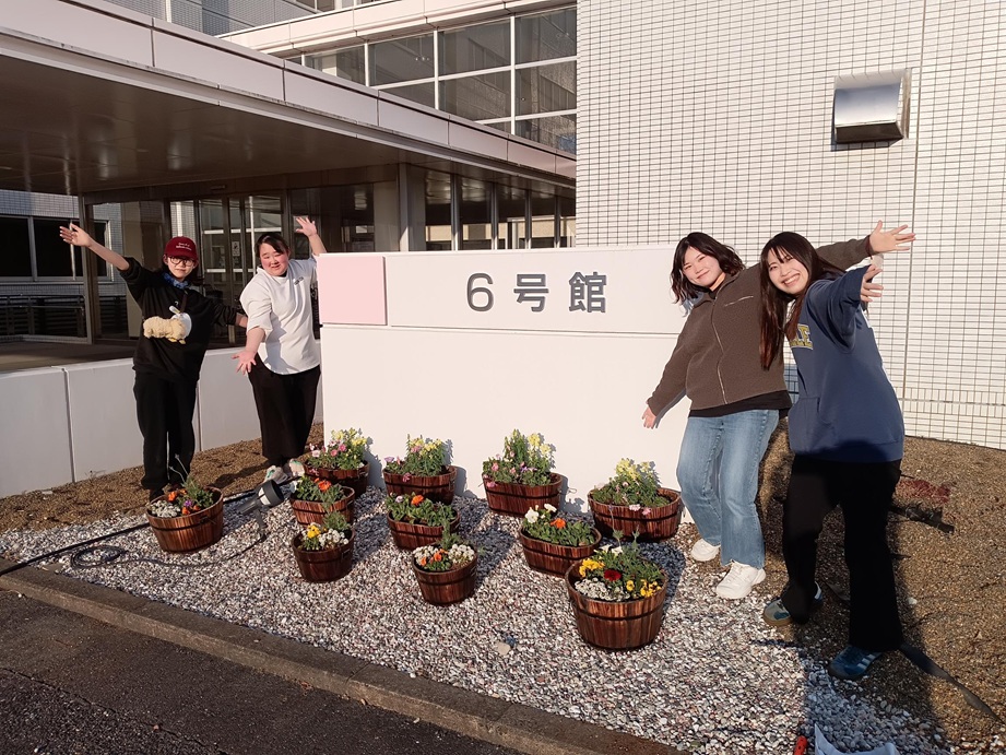 作業療法学科の学生が中心となって活動している園芸愛好会では、昨日、6号館の玄関前に色とりどりの花を植えた植木鉢を並べました。