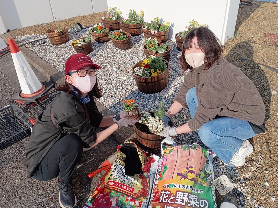 今回植えたのは、ビオラ・金魚草・ペチュニア・マーガレット・ラベンダーなど、春を感じられる人気の花ばかりです。キャンパスの入口が一気に華やかになりました。