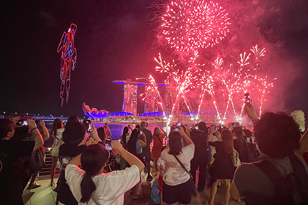 マリーナベイ・サンズ前で繰り広げられる幻想的なライトショーを鑑賞。夜空を彩る花火と近代的な建築のコントラストは、学生たちの目に焼き付いたことでしょう。
