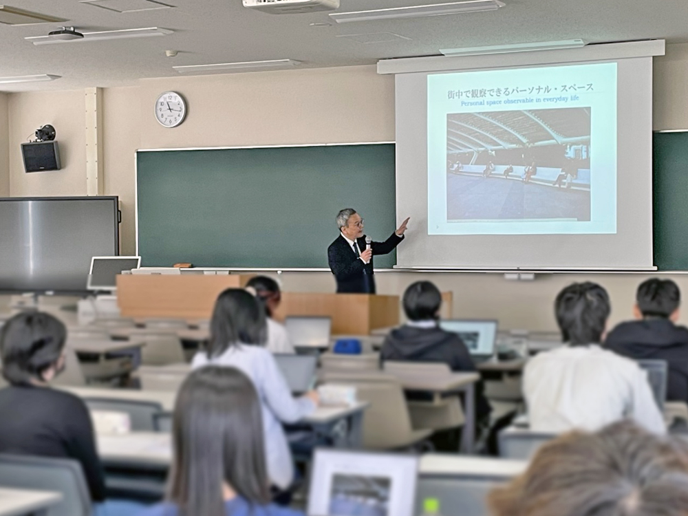 今回紹介する「心理学への招待」は、1年生の必修科目です。 この授業のねらいは、心理学科に入学したばかりの学生に、「心理学」という学問の幅広さを知ってもらうことです。 そのため、心理学科のさまざまな先生が、自分の研究している分野について毎週1人ずつ紹介していく形で授業が進みます。 この日は末次晃教授が、「パーソナル・スペース(他者に近づかれると不快に感じる、自分のまわりの空間)」をテーマに、心理学ではどのように研究を行うのかを紹介しました。