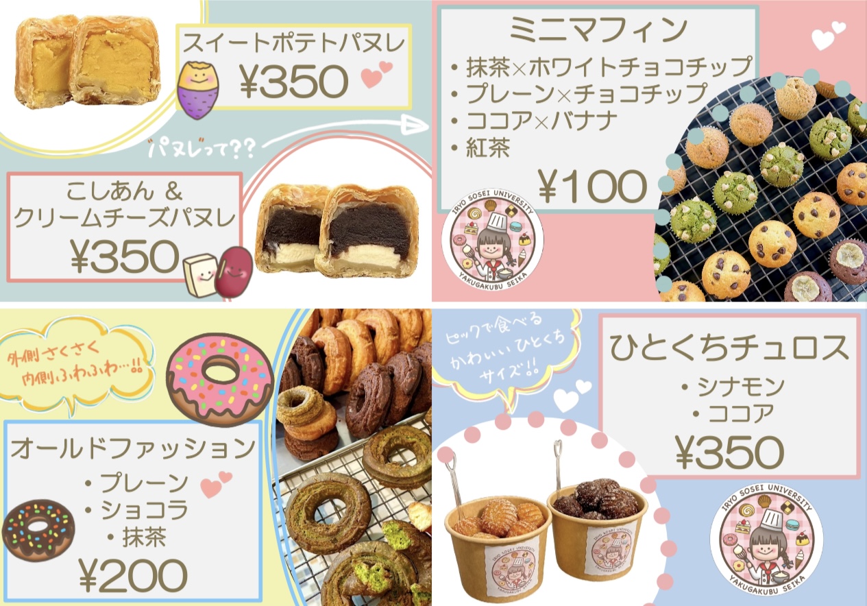 製菓愛好会はチュロス、オールドファッション、パヌレ、ミニマフィンを販売いたします。